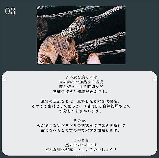 通常の黒炭は原料の木材を伐採後そのまま使う場合と、数週間ほど自然乾燥させる場合があります。