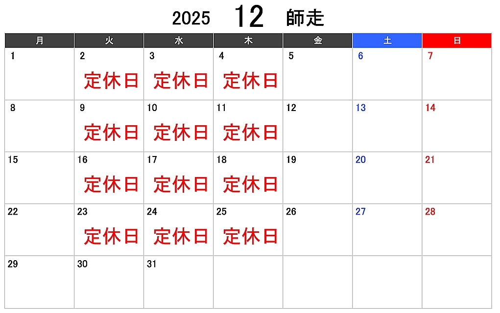 【12月からは、火曜・水曜・木曜の定休日です】